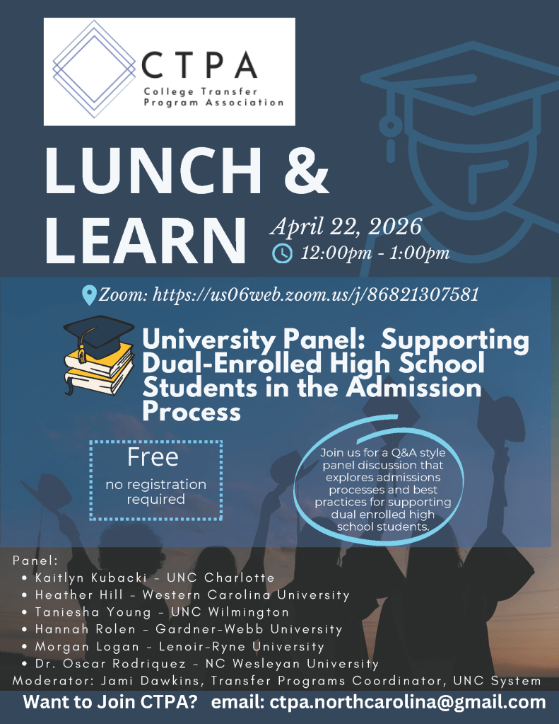 Celebrate National Transfer Student Week with CTPA as we host Lunch & Learn sessions each day highlighting Guaranteed Admissions pathways and transfer initiatives across North Carolina.